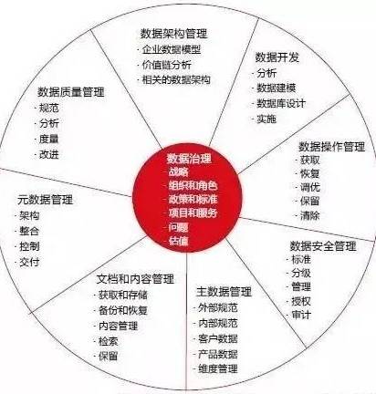 数据治理是技术与管理相结合的一套持续改善管理机制,贯穿在数据管理的整个过程中,通常包括了组织架构、政策制度、技术工具、数据标准、流程规范、监督及考核等方方面面,将其他几个数据管理职能贯穿、协同在一起,让企业的数据工作成为一个有机整体而不是各自为政。数据治理涉及的IT技术主题众多,包括元数据管理、主数据管理、数据质量、数据集成、监控与报告等。